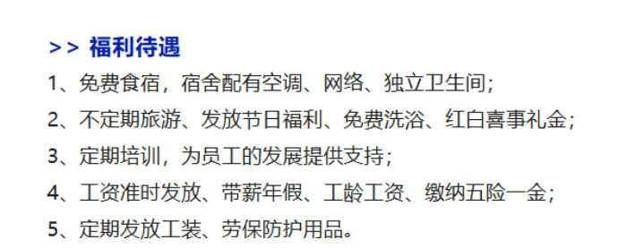 至于真正入职员工的待遇,2024年8月公司官方微信公众号详细展示了各种福利。食宿全免费,宿舍标准很高,自带空调、独立卫浴和网络。上班还有洗浴间、定期发工装和防护用品,啥都不用操心。公司常规福利包括节日补贴、定期旅游,还有红白礼金关怀,工资按时发、五险一金全都缴纳,带薪年假和工龄工资也不能少。最让人踏实的是,公司还为员工建立了培训体系,职业晋升通道相当清晰——不是那种只在招聘广告里写写的空头支票,而是真的可以升。