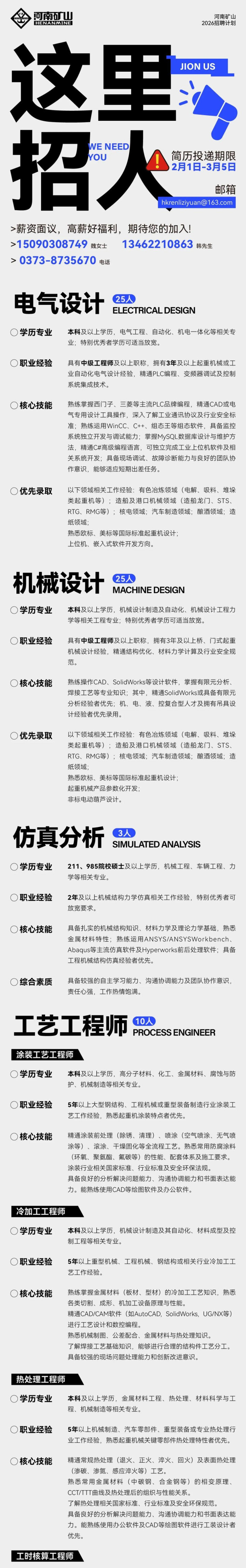 河南矿山这次招聘计划一出来,关注度瞬间拉满,尤其官方明确了要招63个关键技术岗位,包括电气设计、机械设计、仿真分析、工艺工程师这些全链条岗位,而且全部关乎起重机械研发和生产环节。不夸张地说,电气设计和机械设计这两个板块就给了50个名额,几乎占据了整个招聘计划的八成,剩下的仿真分析岗位还要211或985硕士以上学历才有资格,每个工艺技术岗都要求有5年以上大型装备制造的经验。仿佛打工人就是被高要求和高福利一把推到天堂门口。